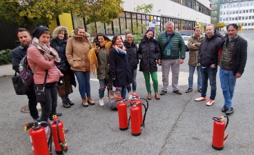 Auch Teil der Schulung waren praktische Löschübungen, die die Teilnehmenden im Freien im abgesperrten Areal am Standort Kreuzberg durchführten. So hatten alle die Möglichkeit, Erfahrung mit der Bedienung von Feuerlöschern zur Ablöschung von Bränden zu sammeln, um im Ernstfall routiniert vorgehen zu können. Wichtiges Wissen dabei ist, dass es unterschiedliche Feuerlöscher für unterschädliche Feuer und Gegenstände gibt: Nicht jedes Löschmittel eignet sich für jedes Feuer.