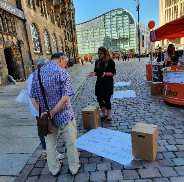 Gemeinsam mit den Initiatoren aus dem Netzwerk, z. B. der Verbraucherzentrale, der Bibliothek, der EUTB und dem Mehrgenerationenhaus hielten die Kolleginnen von koalpha während dessen an einem Informationsstand auf dem Neumarkt die Stellung. Eine Fußbodenzeitung mit provokanten Fragen und eine Schriftprobe in Sütterlin forderten Passanten auf, sich am Diskurs um geringe Literalität zu beteiligen. Am Ende des Tages waren viele interessante Gespräche und ein spannendes Stimmungsbild zustande gekommen. Und natürlich war der Preisetisch nur noch kärglich bestückt. Aber der Actionbound ist nach wie vor spielbar und vielleicht rückt die Chemnitzer Kollegin ja noch das ein odere andere Präsent raus.