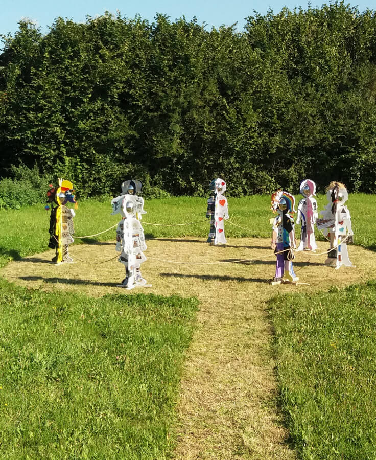 - 7 Collage-Skulpturen, von unterschiedlichen Mitwirkenden kreativ gestaltet, als verbundener Kreis einer Gemeinschaft aufgestellt.