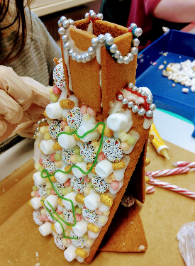 Anschließend wurde das Lebkuchenhaus noch mit kleinen Süßigkeiten verziert – und ab und zu natürlich auch genascht.