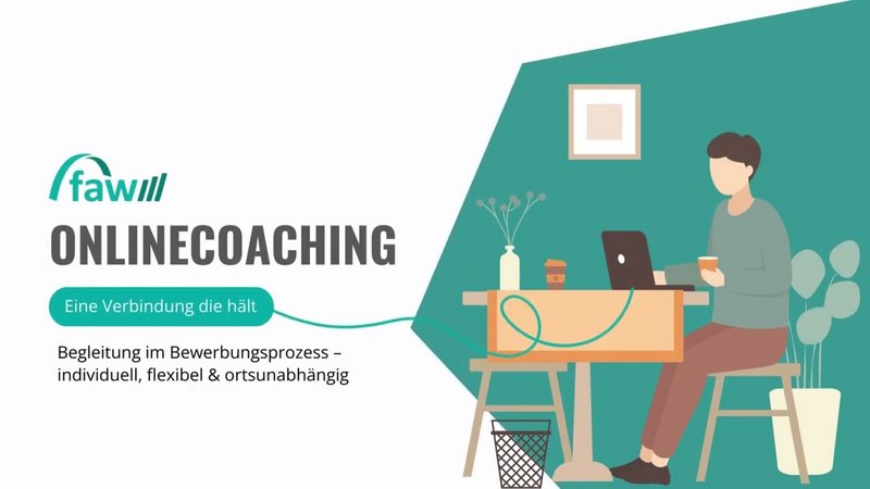 Im Hintergrund spielt leise Musik. Zu sehen ist das Logo der faw, darunter der Text: ONLINECOACHING – Eine Verbindung die hält. Begleitung im Bewerbungsprozess – individuell, flexibel & ortsunabhängig.