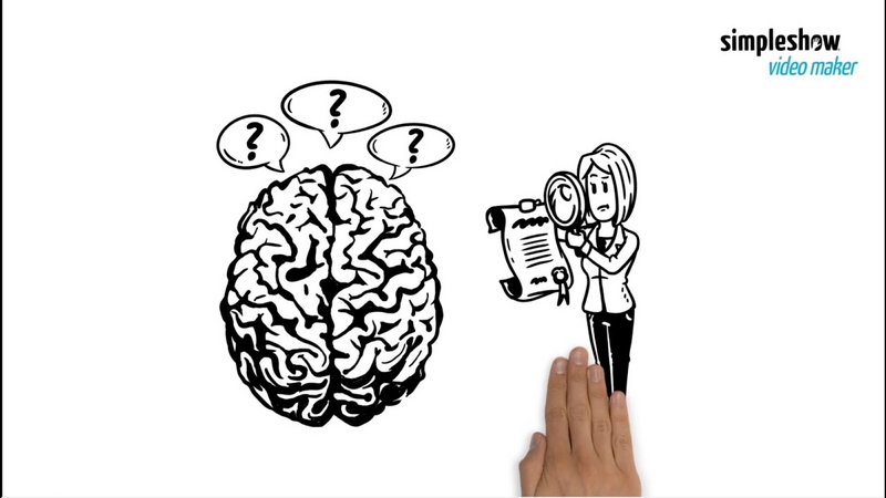 Eine Hand schiebt von unten das Bild eines Gehirns auf den Bildschirm. Darüber erscheinen drei Fragezeichen.
